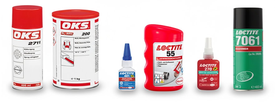 Mit den richtigen Produkten lässt sich die Instandhaltung effizient und sicher gestalten. LOCTITE bietet Kleb- und Dichtlösungen, die Reparaturen und Verbindungen dauerhaft sichern. OKS liefert Schmierstoffe und Reiniger, die den Verschleiß minimieren und Bauteile zuverlässig schützen.